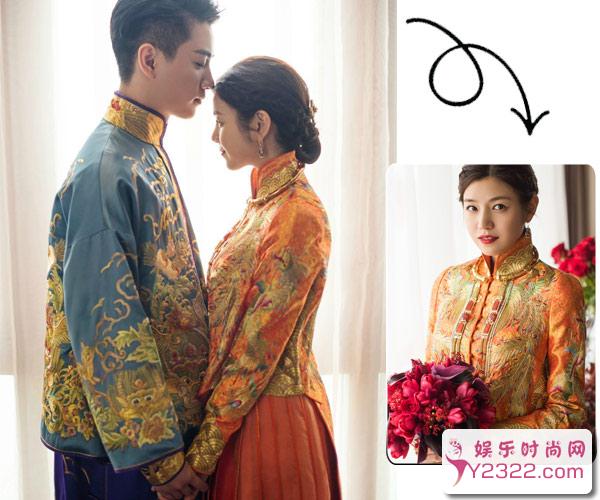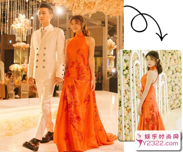 在北京婚宴上,陈妍希陈晓所穿橘黄色中式礼服分别耗时3985小时、1880小时,新郎礼服上的瑞兽、龙纹刺绣,象征麒麟送子,富贵吉祥,出自郭培玫瑰坊高级定制。