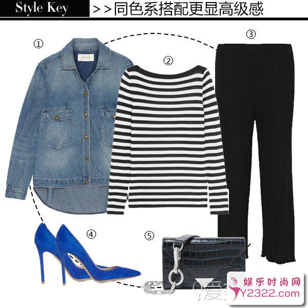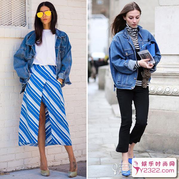 牛仔外套街头风的感觉很重,而满大街撞衫的原因也是因为风格太相似。OL上班族想要穿牛仔外套,会担心不够正式不够高级,那么不妨试试同色系的搭配吧!左边的牛仔蓝+白T+海军条纹半身裙清爽又时髦;右边的搭配乍看很普通,但是一双宝蓝色的高跟鞋就点亮了整个look,你学到了吗?