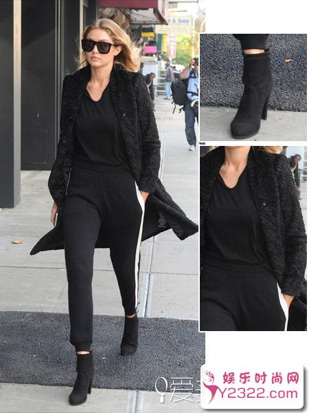 【搭配示范】:黑色长款外套+黑色运动裤+黑色短靴