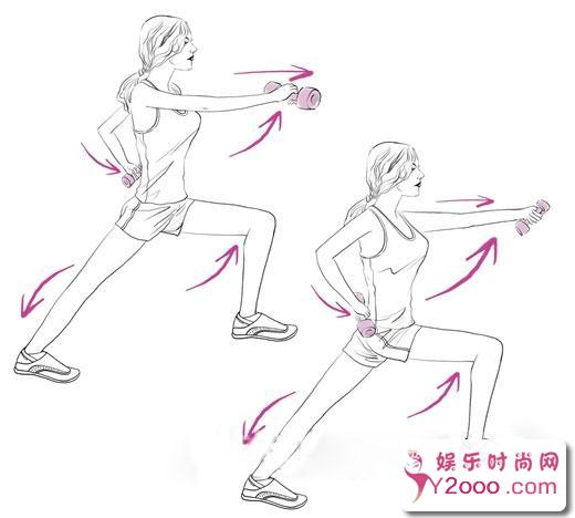 这样做:准备一对5公斤的哑铃,保持弓步蹲,左手放在髋部上,右手上方举高,左腿向左方扭动,重复此动作10次。换另一方向做同样动作。
